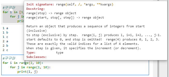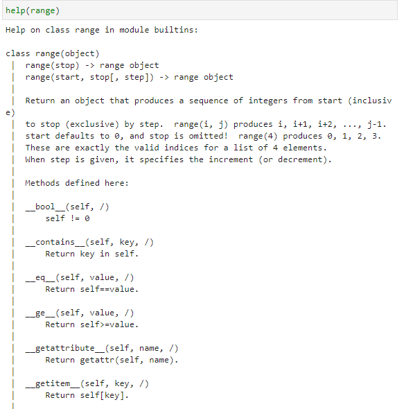 : range와 같은 함수를 help( ) 안에 입력하면 아래와 같이 함수에 대한 설명과 함수를 활용할 수 있는 방법이 출력됩니다.