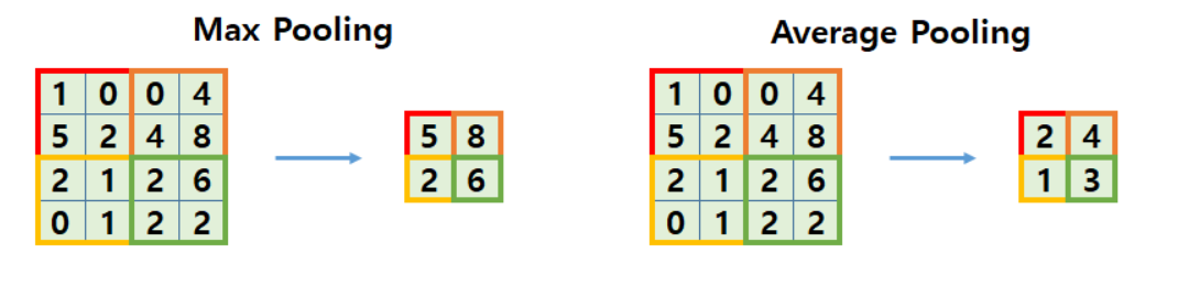 - 종류: Max pooling(최대값), Average pooling(평균값), Min pooling(최소값)